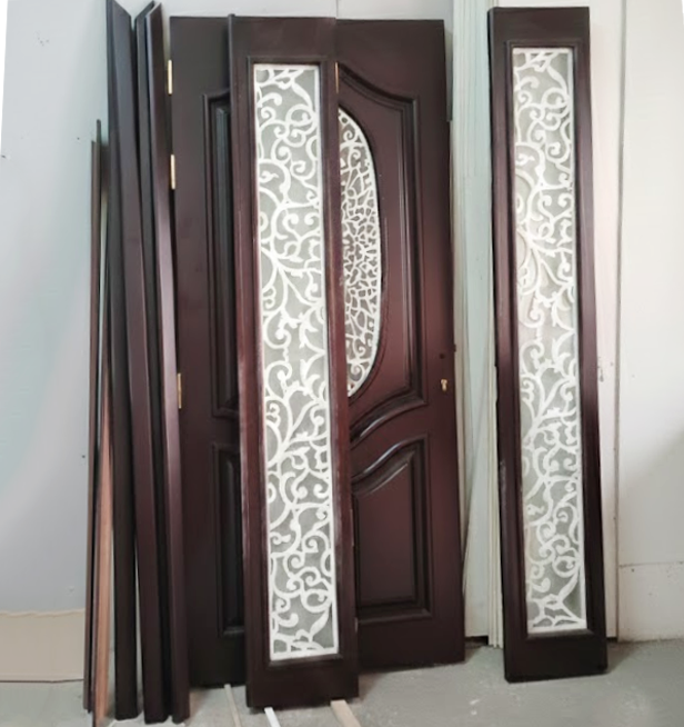 The first design features an exquisite mashrabiya-style fretwork center accompanied by sidelights, allowing a dynamic interplay of light and shadow while preserving privacy. The delicate latticework creates visual depth and cultural richness, transforming the entrance into an architectural feature.