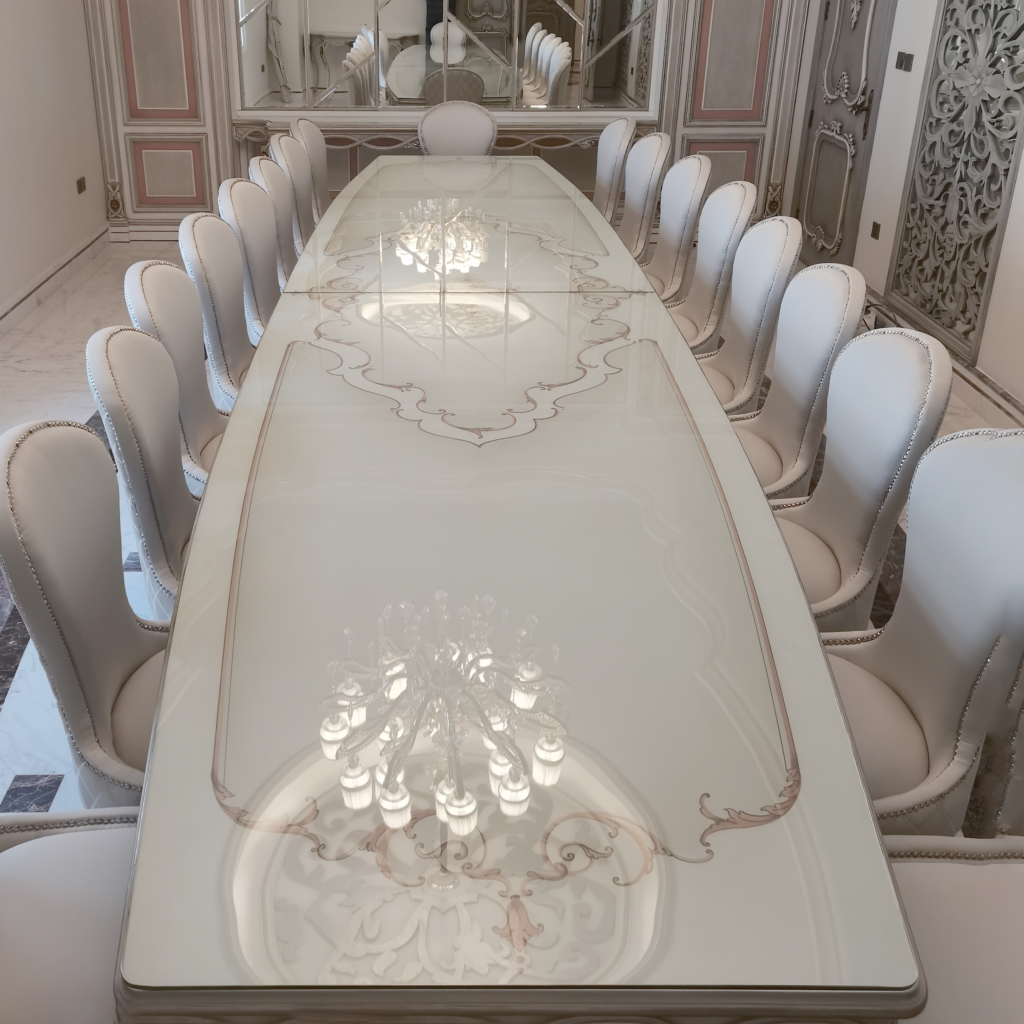 The focal point of the space is an extra-length banquet table featuring a hand-painted and inlaid top. The richly detailed surface is supported by hand-carved cabriole legs, expressing classical European influence and artisanal mastery.